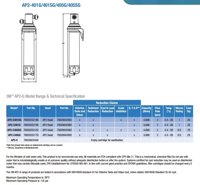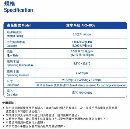 有效過濾水量:1,060加侖 (4,000公升)* * 當水流速度減慢時應更換濾芯,建議每6至9個月更換一次,但亦視乎用水量及水質而異,濾芯最長使用期為12個月。