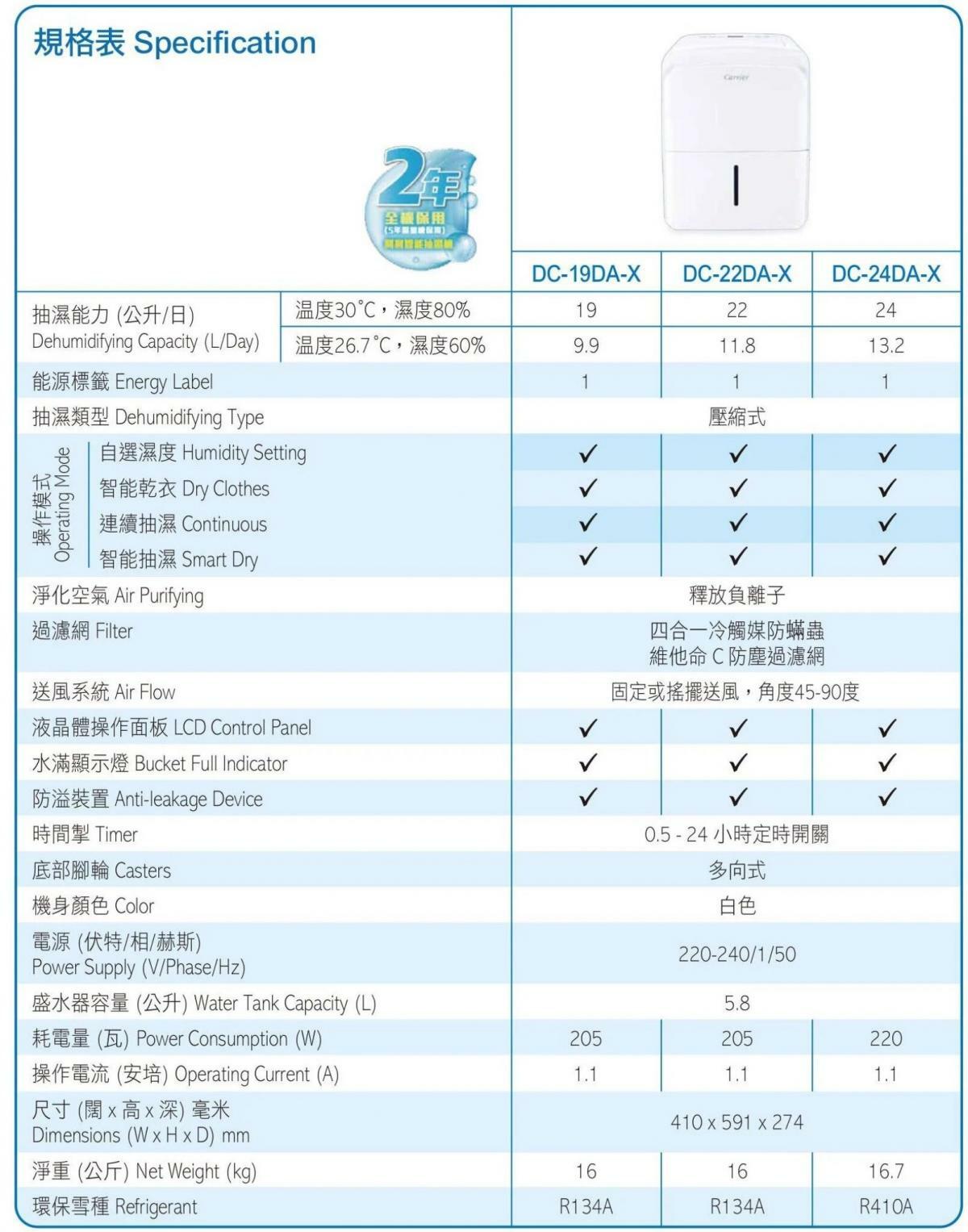 能源效益標籤:1 級 尺寸:高 591 mm X 闊 410 mm X 深 274 mm 保養期:2 年 摩打/壓縮機保養期:5 年 DC-24DA-X ·榮獲1 級能源標籤 ,慳電環保 |